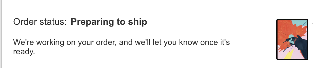 Interesting. I’m actually curious as to why mine hasn’t shipped yet as all of the Apple stores seem to have plenty of stock.My 12.9 (SG, 256) is preparing to ship, but the 11 (SG, 64) I ordered for someone is is still in progress. I wonder if they're waiting for the 11 in order to ship them together.