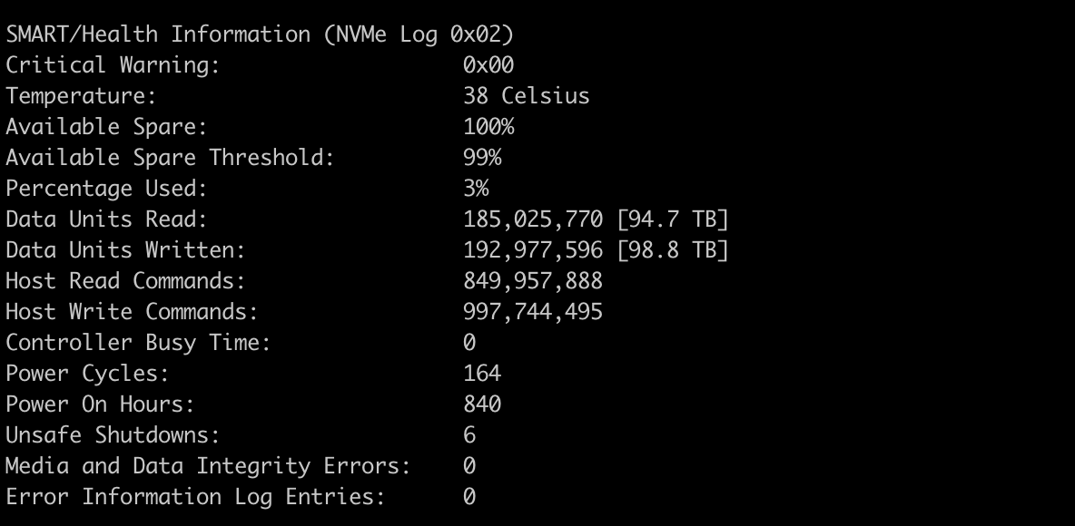 Notice 0 bytes of swap used. That's what you are looking for because I have a theory about what is causing the audio popping: when the memory pressure in vm compressor mode 4 turns orange, it starts aggressively swapping memory to disk. I believe this SSD thrashing and the resulting processing and CPU usage is what causes the audio popping and general performance degradation. I especially believe this is the case after looking at my SSD health. Keep in mind I've had this MBP 16 M1 MAX 32GB since the end of november 2021. Here are my SSD health stats after 6 months of use (May 2022), in order to look at the SSD stats I recommend installing Homebrew and using smartmontools on the command line (more info here: