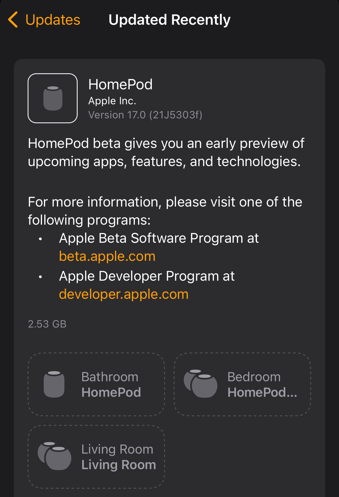 Think those build numbers quoted are incorrectWell the Public Beta is out. It wouldn’t update over the Developer Beta. Delegated the Profile, reloaded the Profile and still NO update. On iOS 17 (21A5277i). Home shoes HomePods on 16.6 Bets (20M5571a) So will play with it tonight and se what happens. One other thig that I want to try is to Factory reset the HomePods and them go through the setup again. Oh what Fun.