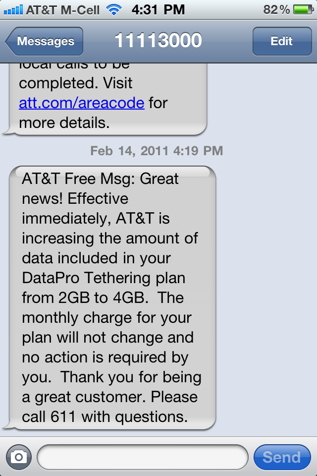 Great news! Effective immediately, AT&T is increasing the amount of data included in your DataPro Tethering plan from 2GB to 4GB. The monthly charge for your plan will not change and no action is required by you. Thank you for being a great customer. Please call 611 with questions.