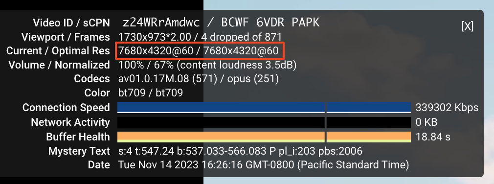 The `Stats for nerd` overlay on the video. Only 4 dropped frames for me.
