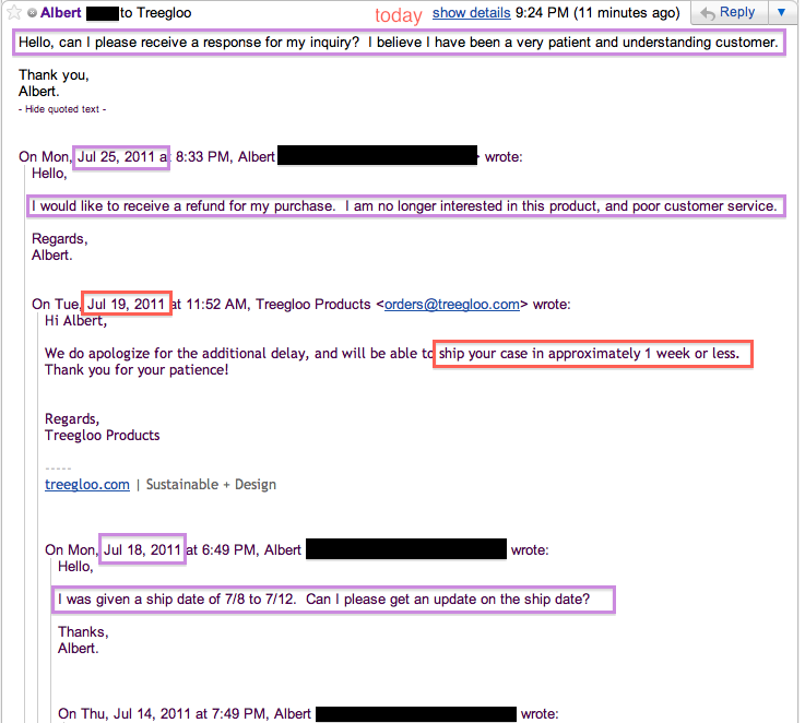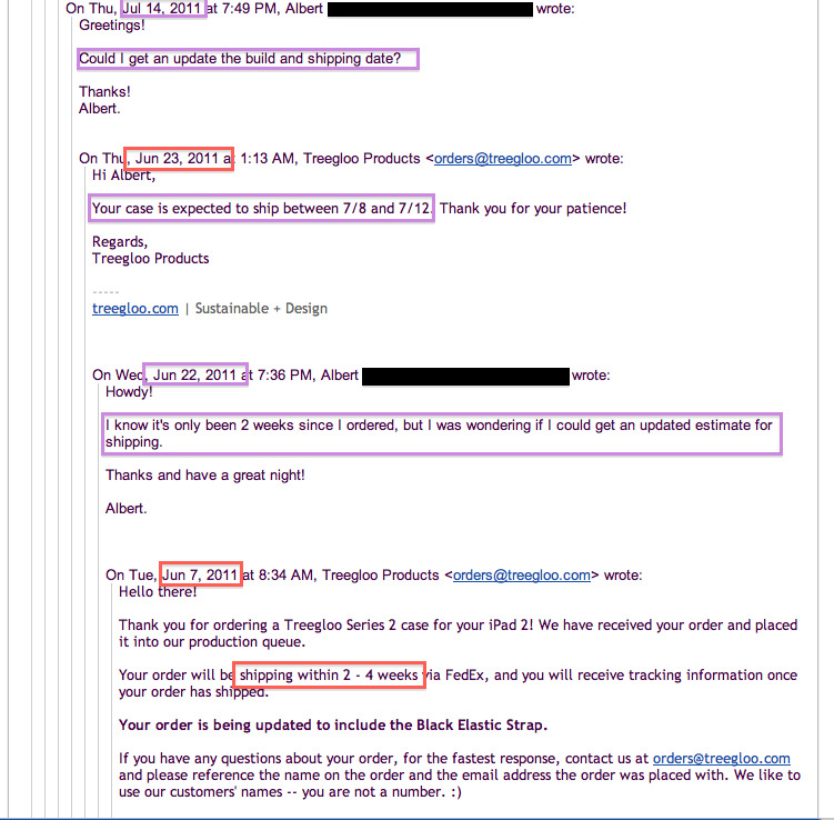 I ordered a Treegloo case for my iPad 2 seven weeks ago. Long story short, I was given a 2-4 week estimate (till it shipped). That slipped to another week. Then another week. I still haven't received notification of shipment.