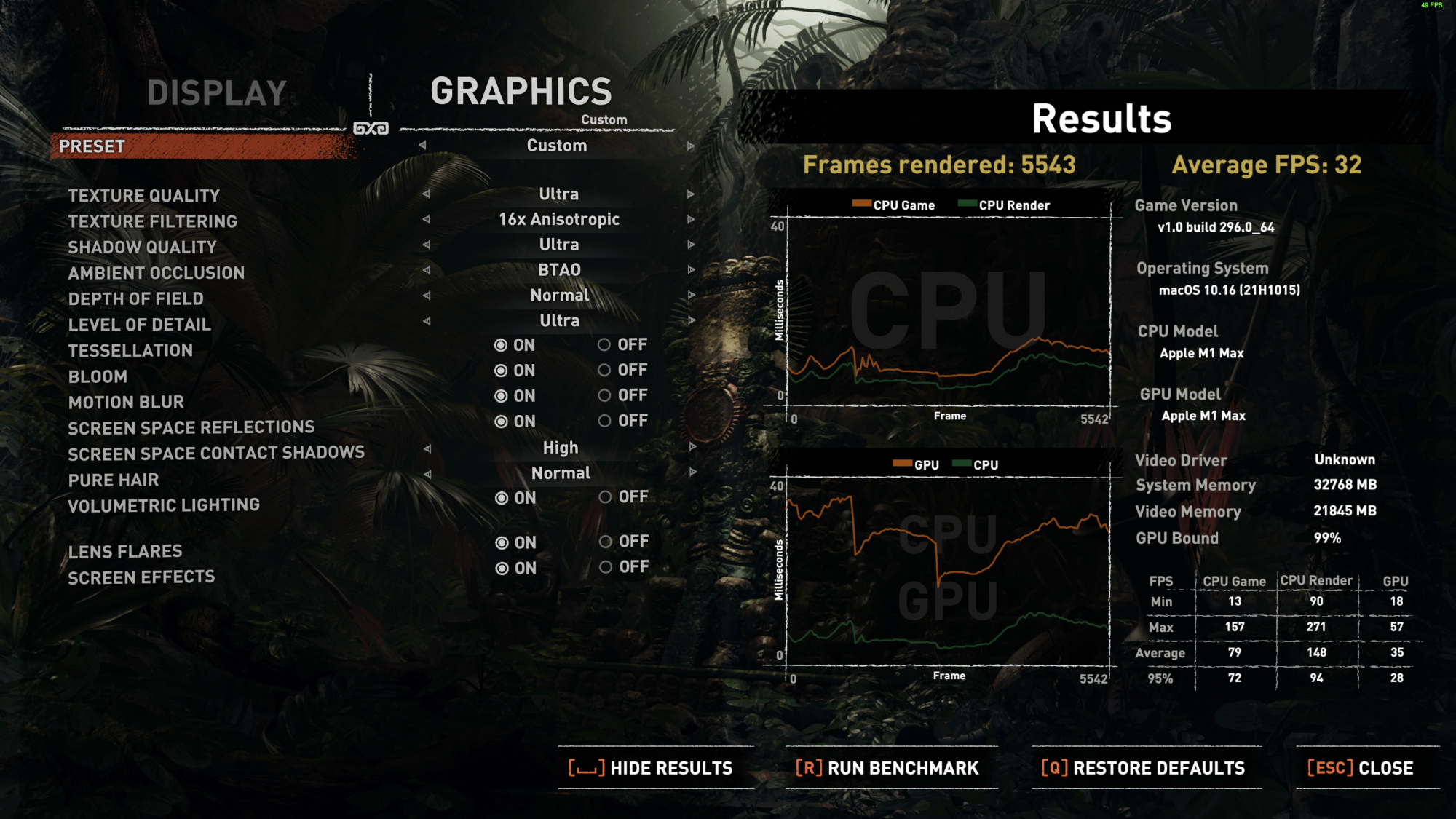 When I choose higher resolutions like 1800p or ultra settings it gives a warning about needing more than 4 GB. During benchmarking it uses about 5.5 GB. During gameplay it uses about 8.7 GB. With 36 GB you have more than enough for VRAM in an Apple Silicon Mac if you don’t use lots of other apps in the background at the same time.