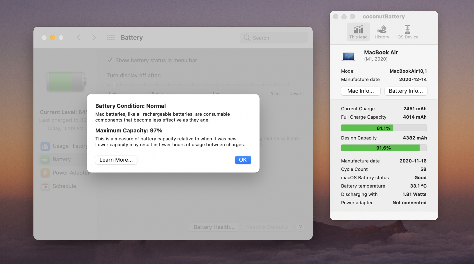 8 months MBP M1 here (from Jan 2021) - constantly plugged when on, disabled Battery optimization, installed AlDente charge limiter (freeware) that limits the charge to 60%. Battery health (according to Apple) is at 100%...View attachment 1823043