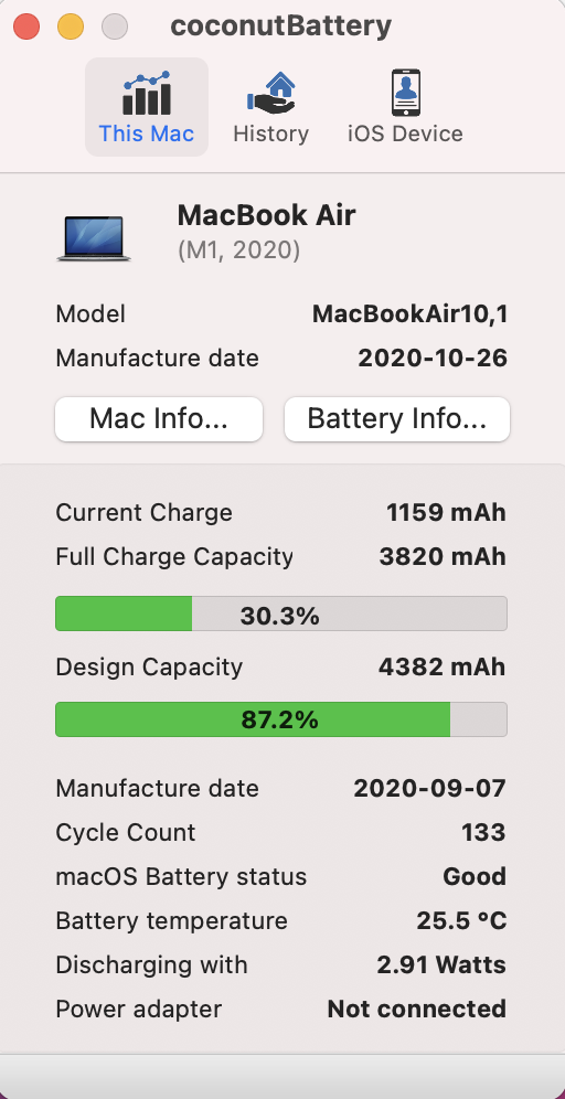 you may try to visit apple genius bar...they will read only their own report...but if its under 90% you should get a battery replacementOP here. Here's the latest reading... temp is 74F, coconutBattery is reporting 84.2%. Coming up on owning this for a year so I may visit Apple Genius bar for a potential battery replacement. Apples own Battery Health reports 89%.