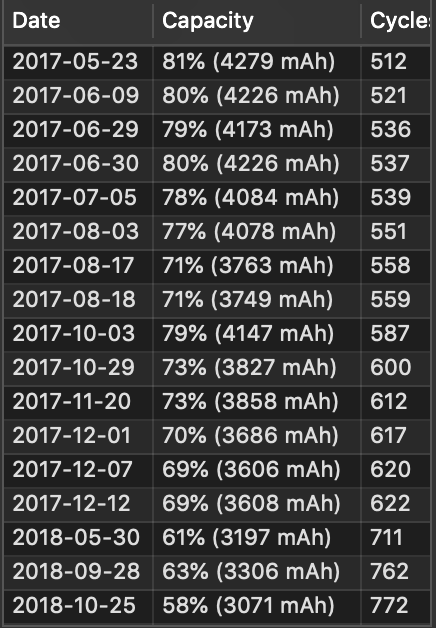 It's from CoconutBattery (just google it). You have to log in a regular rhythm to get a listing like this.How do you get the listing of the battery cycles?