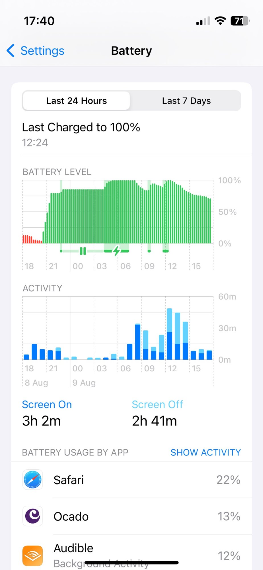 Sure, but it doesn't really show anything (first screenshots are last 24 hours, rest are last 7 days) As I've already said, safari is the highest drain but then nothing else seems to be using too much at all. I hard close down apps after I finish using them so little running in the background. I deleted facebook as that was using a reasonable percent, but it hasn't improved since.