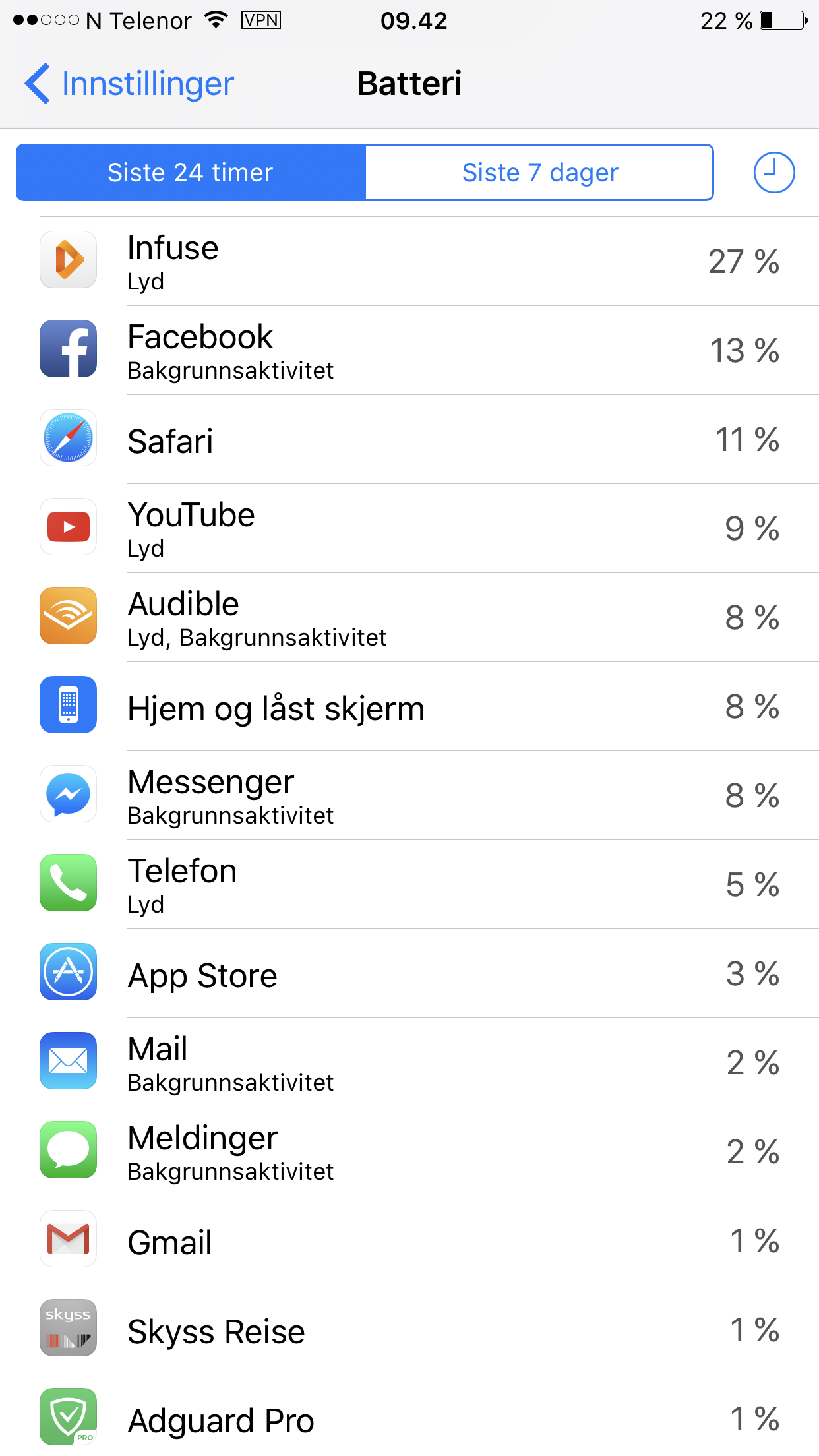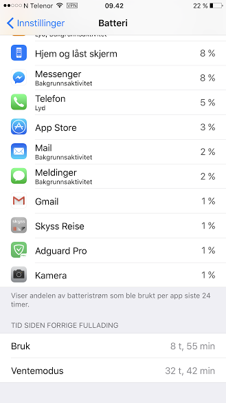 I have location and 4G turned on, background app refresh turned off, push notifications turned on for a few apps like Gmail, Messenger etc and one exchange-account with 15 minutes pull of new emails. My brightness level is set to auto and I've had bluetooth on when in the car and while listening to audio books for maybe 1,5-2 hours.