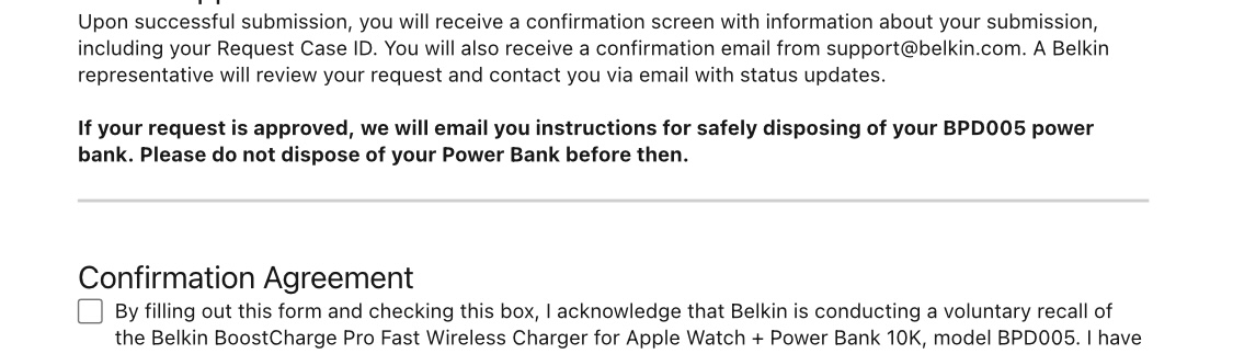 Belkin last month voluntarily recalled the BoostCharge Pro Fast Wireless Charger for Apple Watch + Power Bank 10K (model BPD005). The company said it will be offering a full refund to all customers who purchased the product.