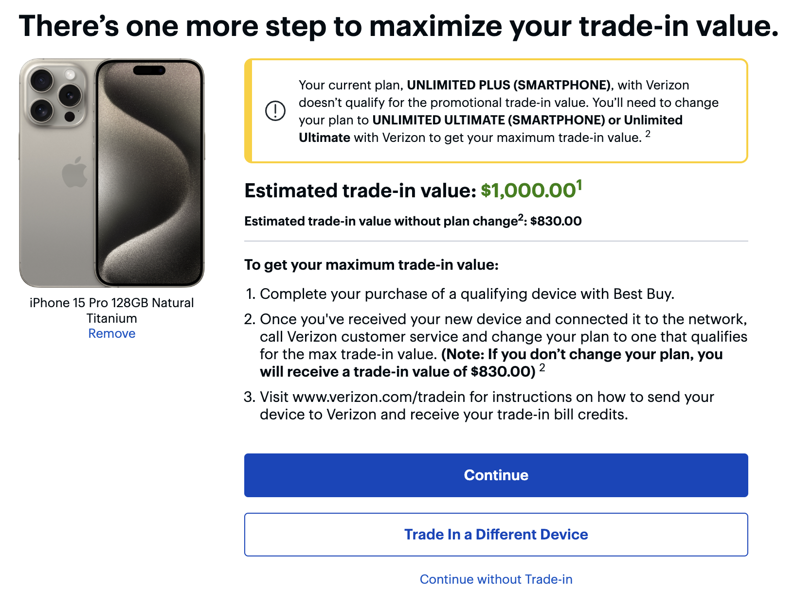 I'm aware of that, but why is the trade in value $0 on Unlimited Plus? The estimated trade in value without plan change should be $830, but it says $0.