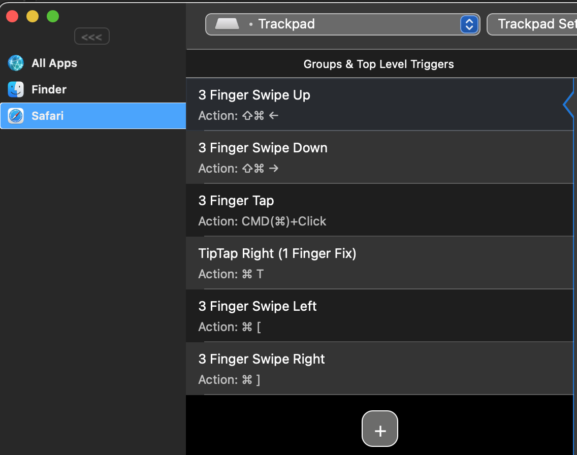 Then a bunch of touchpad shortcuts for Safari, as below--- gives you easy touchpad control to open/close tabs, open link in a new tab, go to Tab to the left/right, go back/forward all with easy finger taps..