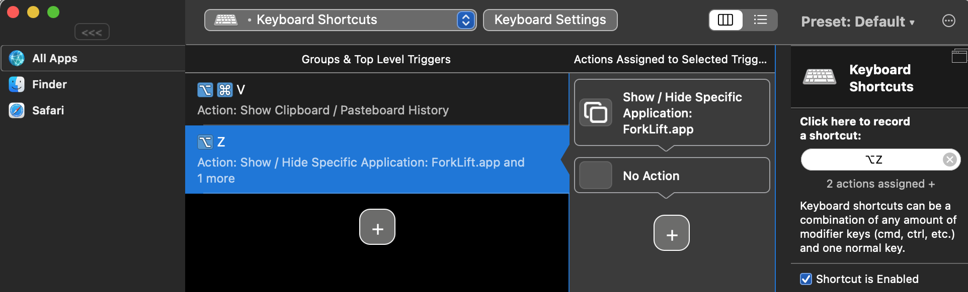 Thanks for that. I configured as per your setting and I get the same thing happening when using the keyboard shortcut as well. If I open a Forklift window in twin view then hit the minimise control on the window (yellow -) if I then look to use the keyboard shortcut then toggling it makes the Forklift app icon pop in and out of the app bar, no window shows on screen. However if I have the Forklift window on screen and use the keyboard shortcut and then toggle it the window does appear and hide again. So is the trick not to use the minimise control on the forklift window?Well, use your gesture to show/hide the application - I use a keyboard shortcut as below - and bonus! the keyboard shortcut above it gives you easy access to another BTT fab feature... the built in clipboard manager (so pressing cmd-option-v shows the clipboard manager rather than the simple command-V to paste the last copied item only)