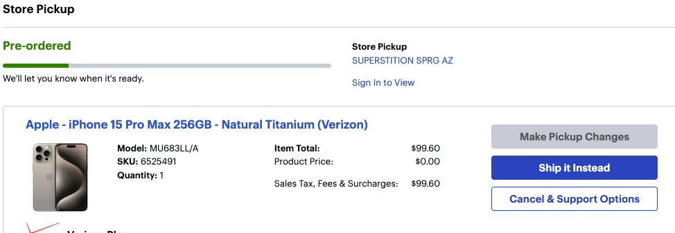 I have ordered through Verizon, but shows a delayed delivery. That is why I was thinking of checking if I could do a store pickup.When I did this for the XS Max, I basically logged into Verizon at 8:00 am on release day and I was able to order for store pickup that morning. Prior to around 8:00 AM on release day, in store pickup wasn't an option. Things may have changed since then though. Also, if you ordered from Best Buy, just cancelling the order may not be enough to release the account upgrade hold on your account so that you can order from Verizon immediately, so you may need to deal with that as well (which is why I'm thinking about cancelling now so I can get it out of the way.)