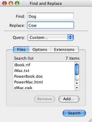 I'll soon be releasing my first Mac OS X native application, MassReplaceIt. Basically it does a find and replace on either the contents or filenames of a list of files you give it, so that you don't have to open them individually (screenshot below). It will be released as freeware.