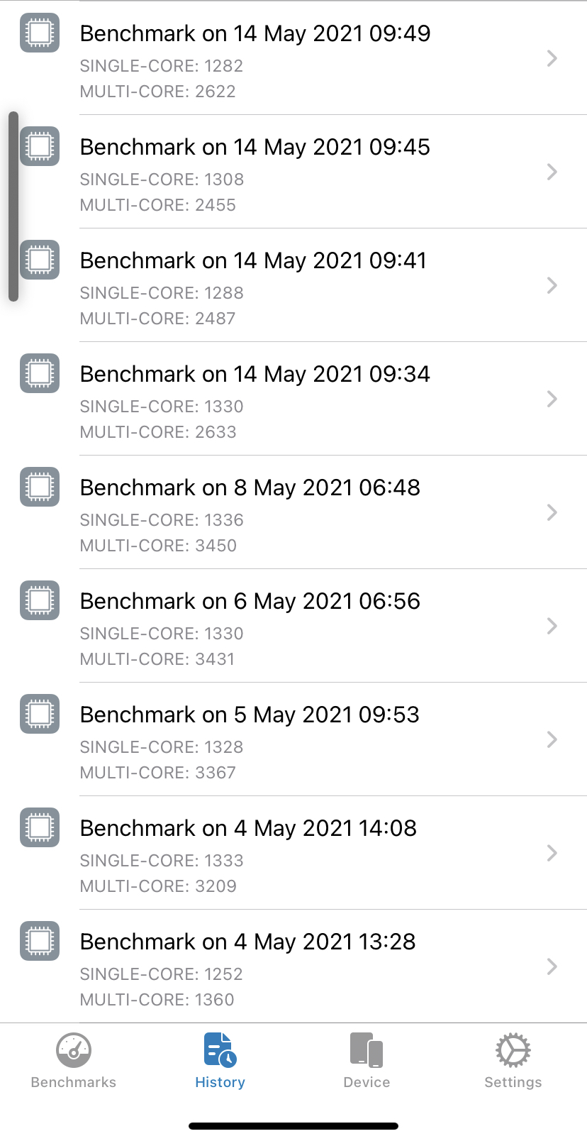 Here you go. iPhone 12 on 14.5.1 , phone been on for past several days.I have tried the hard reset trick numerous times. The geekbench scores return to normal after a reboot, but if I test again a few hours later they are back down.