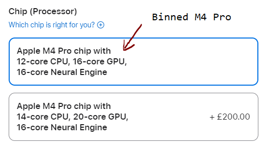 In the M4 Pro example at hand, we have a binned version with 12 CPU cores (8 Performance or simply P cores and 4 Efficiency or simply E cores) and 16 GPU cores, and an unbinned version with 14 CPU cores (10P+4E) and 20 GPU cores. The cores are all of the same type, M4, their number changes: the unbinned version has 2 more CPU P-cores and 4 more GPU cores. More cores, more processing power for the respective CPU or GPU tasks. That is why the more powerful, unbinned version, is more expensive than the binned one. (Likewise, this is why even the binned M4 Pro chip is more powerful than the base M4 chip, which has 10 CPU cores configures as 4P+6E and 10 GPU cores).
