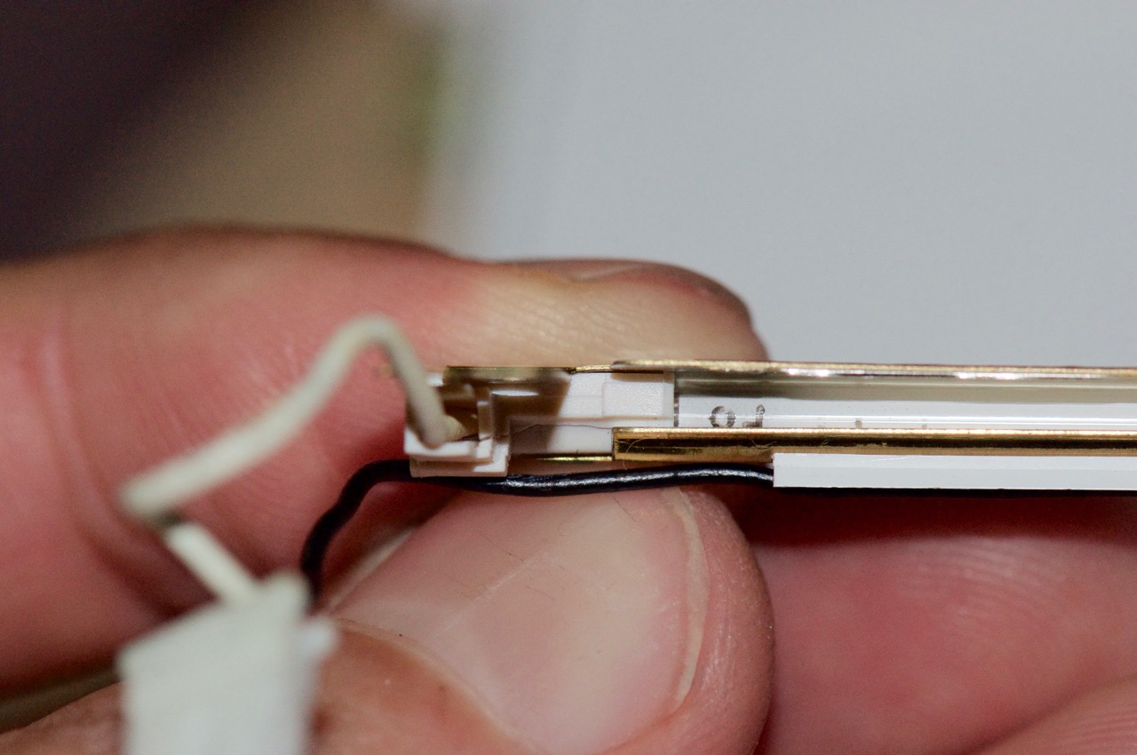 12. I decided to continue on anyway. The first step was to re-solder the connection of the white wire here so that it is straight on instead of being at a 90 degree angle. This will mean I can make up the difference in length by re-positioning the rubber end-caps.