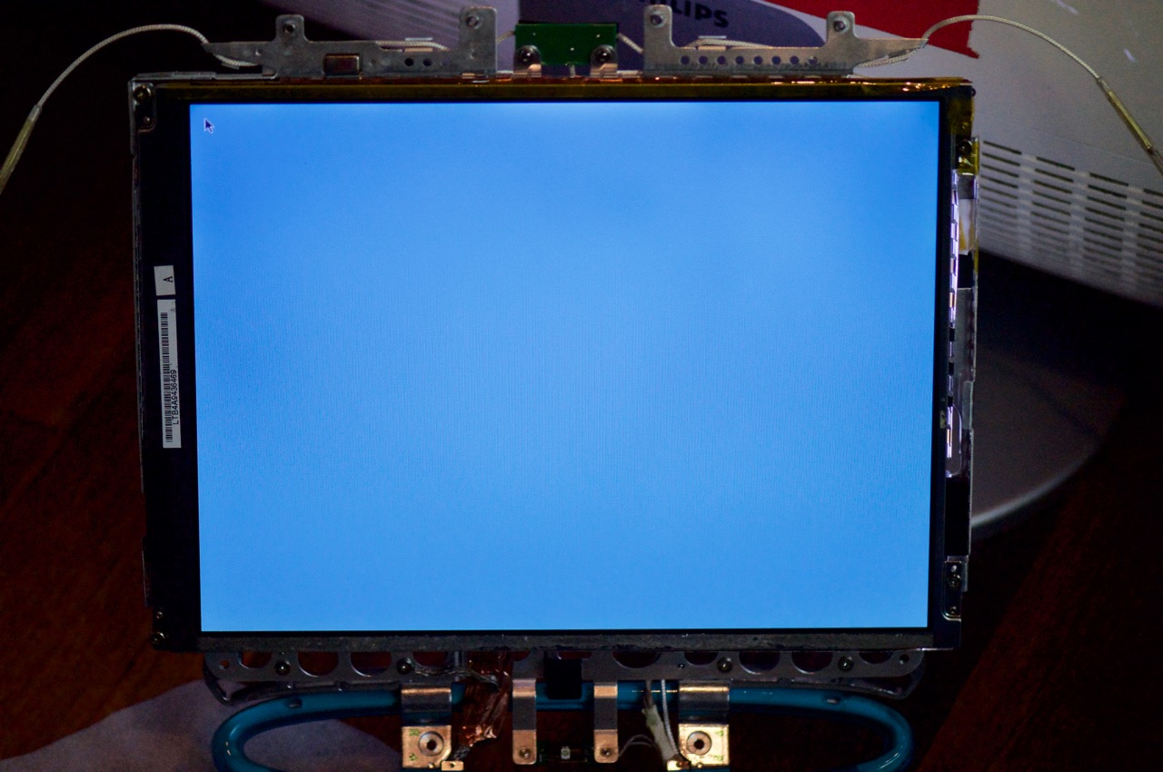 4. Here I've connected the original LCD panel to the backlight inverter and powered it on. The display is so dim it's hardly visible (with the camera flash on).