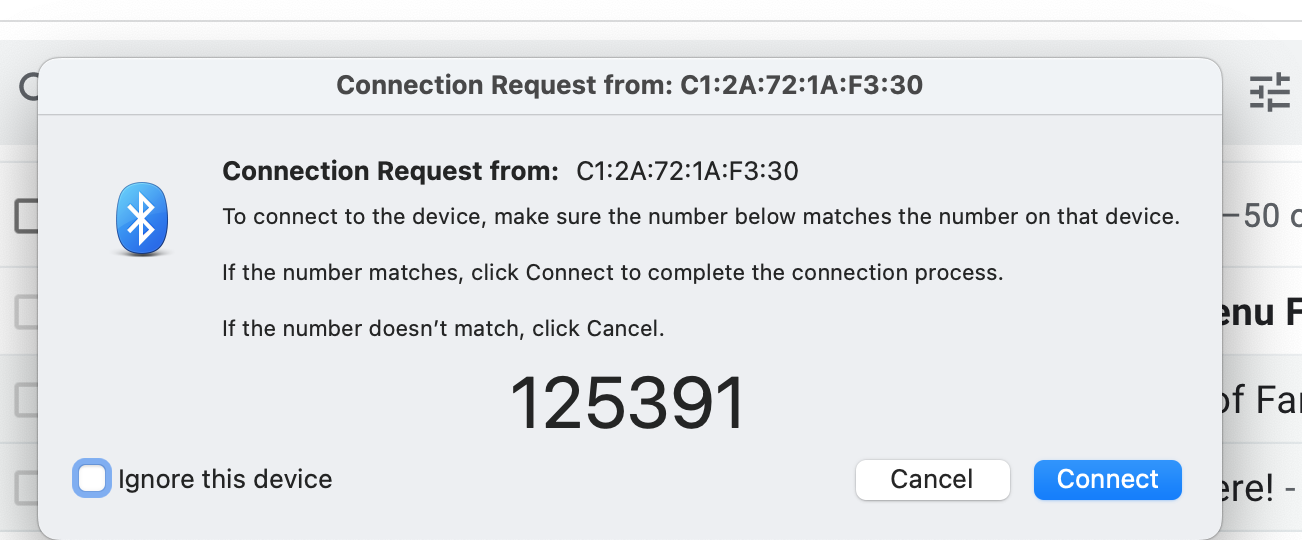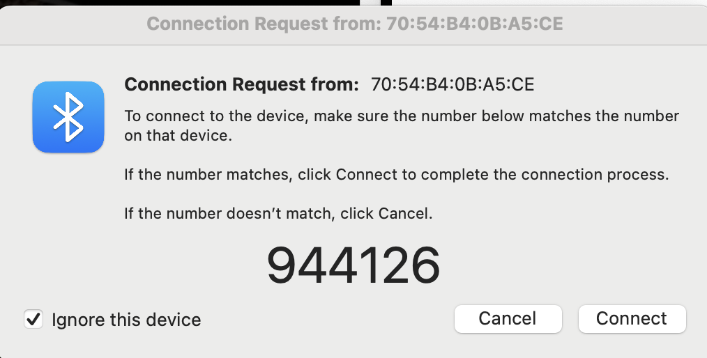 So....I'm working with our MacBook Pro (Retina, 13-inch, Early 2015), 12.3.1, and just this afternoon, started getting a whole lot of BlueTooth connection requests like the attached. Have never seen anything like this before.