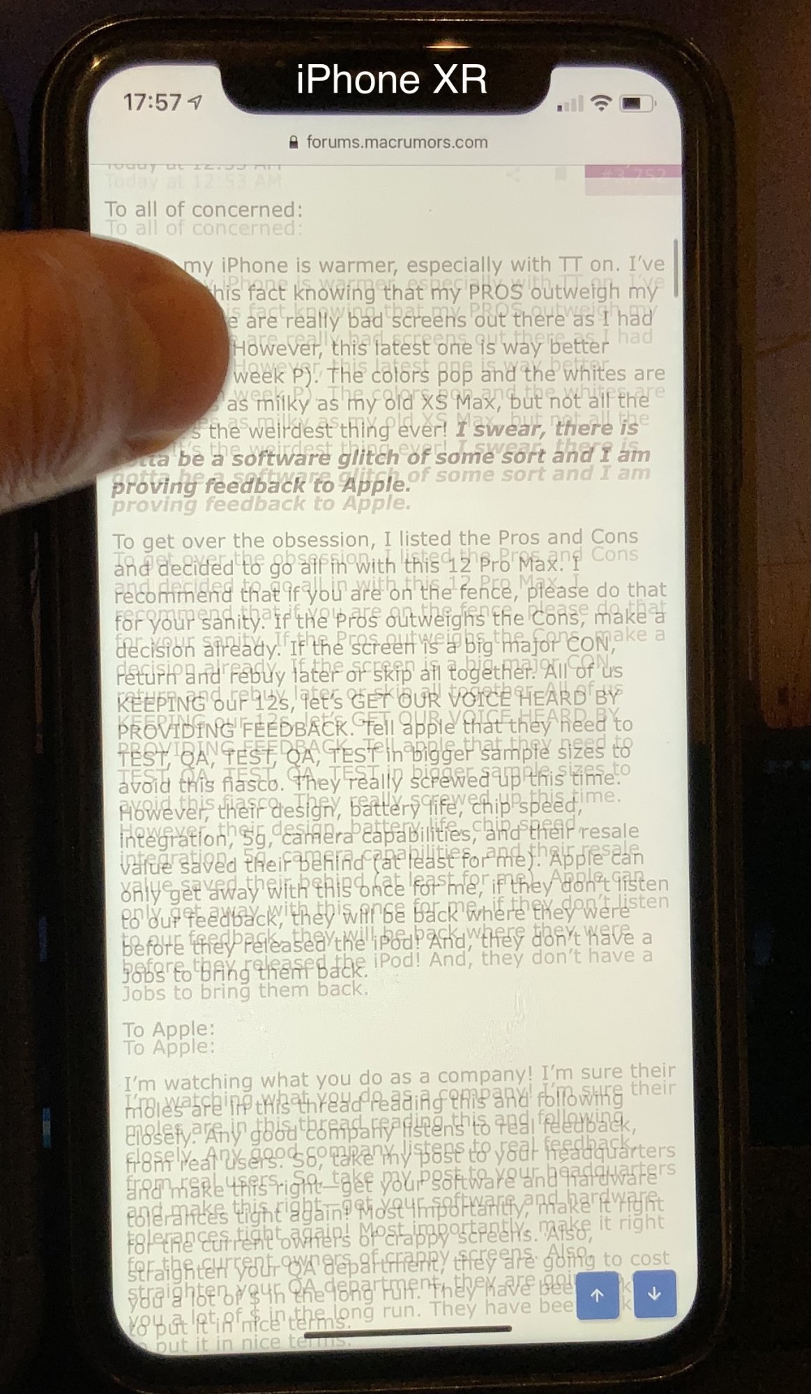 Not sure if these pictures below are helpful at all. Perhaps from the high number of pics i took it seems on the iPhone 12 the different lines of same text are almost of the same intensity/shade, while on the XR there is a main line of text, and a copy of it which is a bit lighter. Maybe that’s why it’s easier on my eyes?