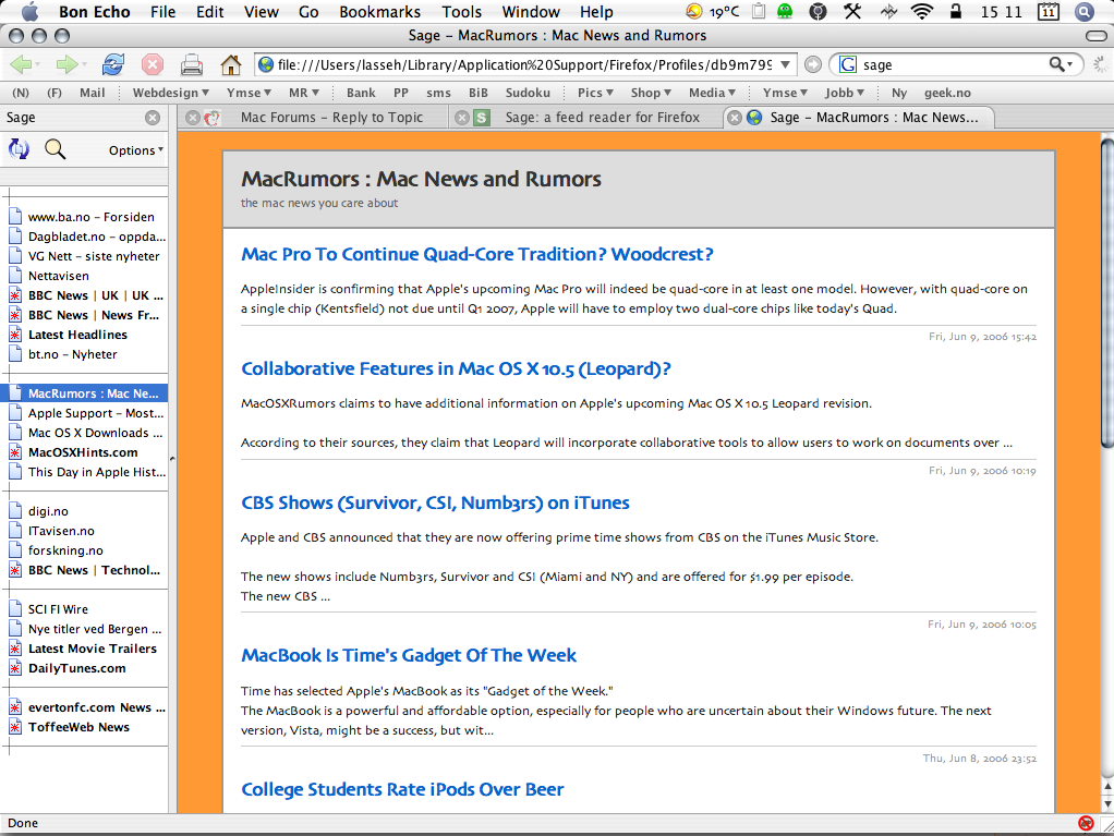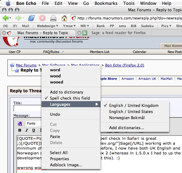 I got Sage working with a minimum of fiddling, and as mentioned before, I now have both UK English and Norwegian spell checking built into Firefox 2 (whereas in 1.5.0.x I had to us the development version of Spellbound to get this). I don't miss Safari for a second... :)