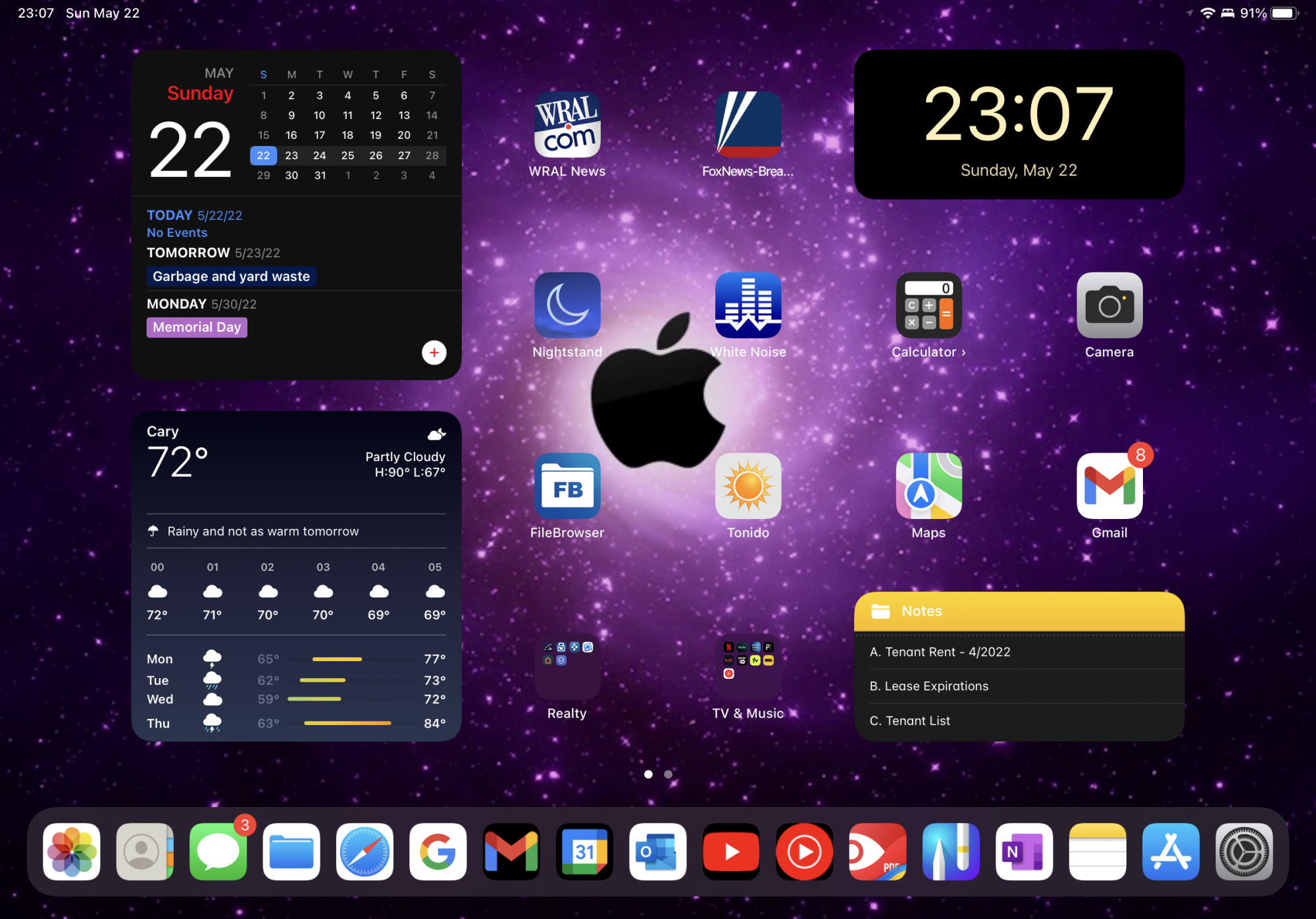 Homescreen..........YouTube................VLC.....................White Noise App.....Nightstand