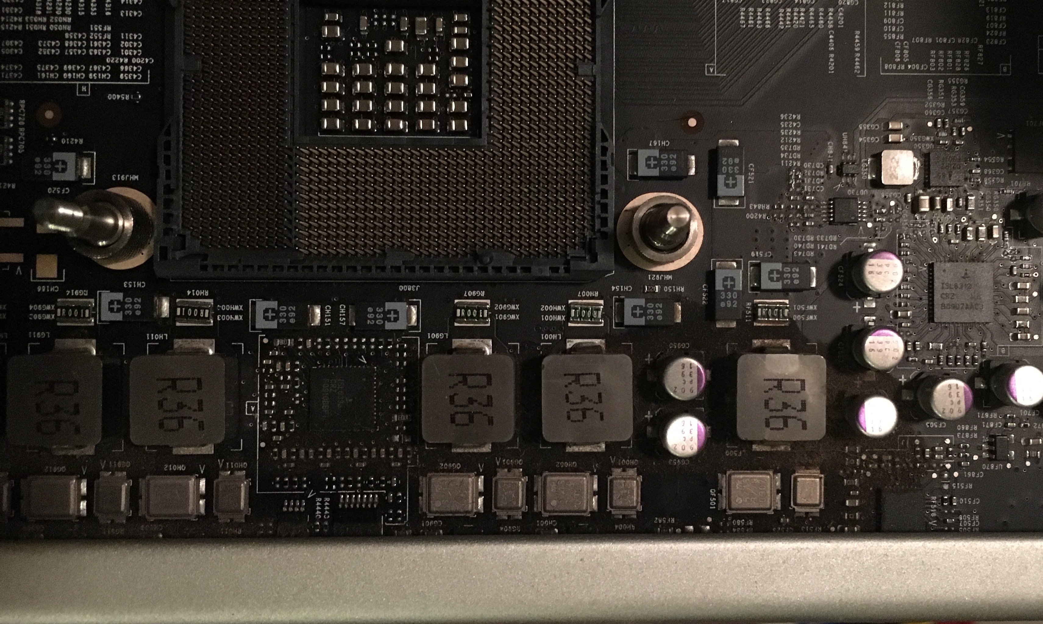 At first I thought it was some components on the board that had failed and were leaking fluid, but looking a second time, it looks more like the residue came from the thermal pads (or the adhesive on them) on the heat sinks. At least the machine is still working fine. Unfortunately a dual CPU tray seems to cost about as much as an entire system.