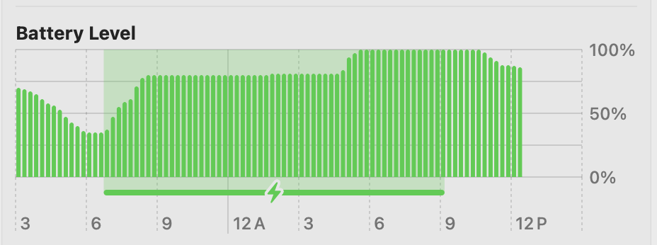 You can see that when I plugged it in last night, it charged until 80% then it waited until morning to charge the rest of the way up to 100%. This puts less stress on the battery since it isn't pushed to 100% until it is needed. This works nearly flawlessly for me except on weekends when it isn't smart enough to keep the level at 80% until Monday morning. It usually stays plugged in all weekend so it would be nice if it kept the battery at 80% until needed for work on Monday.