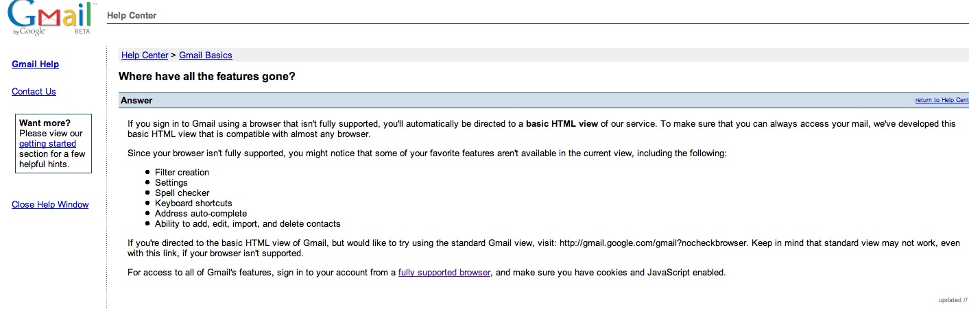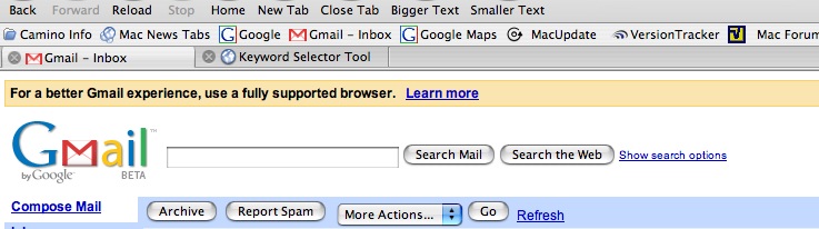 i use Camino now exclusively and all of a sudden today my gmail looked different. now apparently gmail is no longer fully supporting Camino and so you only get a stripped down version with hardly any options. WTF?!! here is a screenshot of what im talking about. firefox is supported.