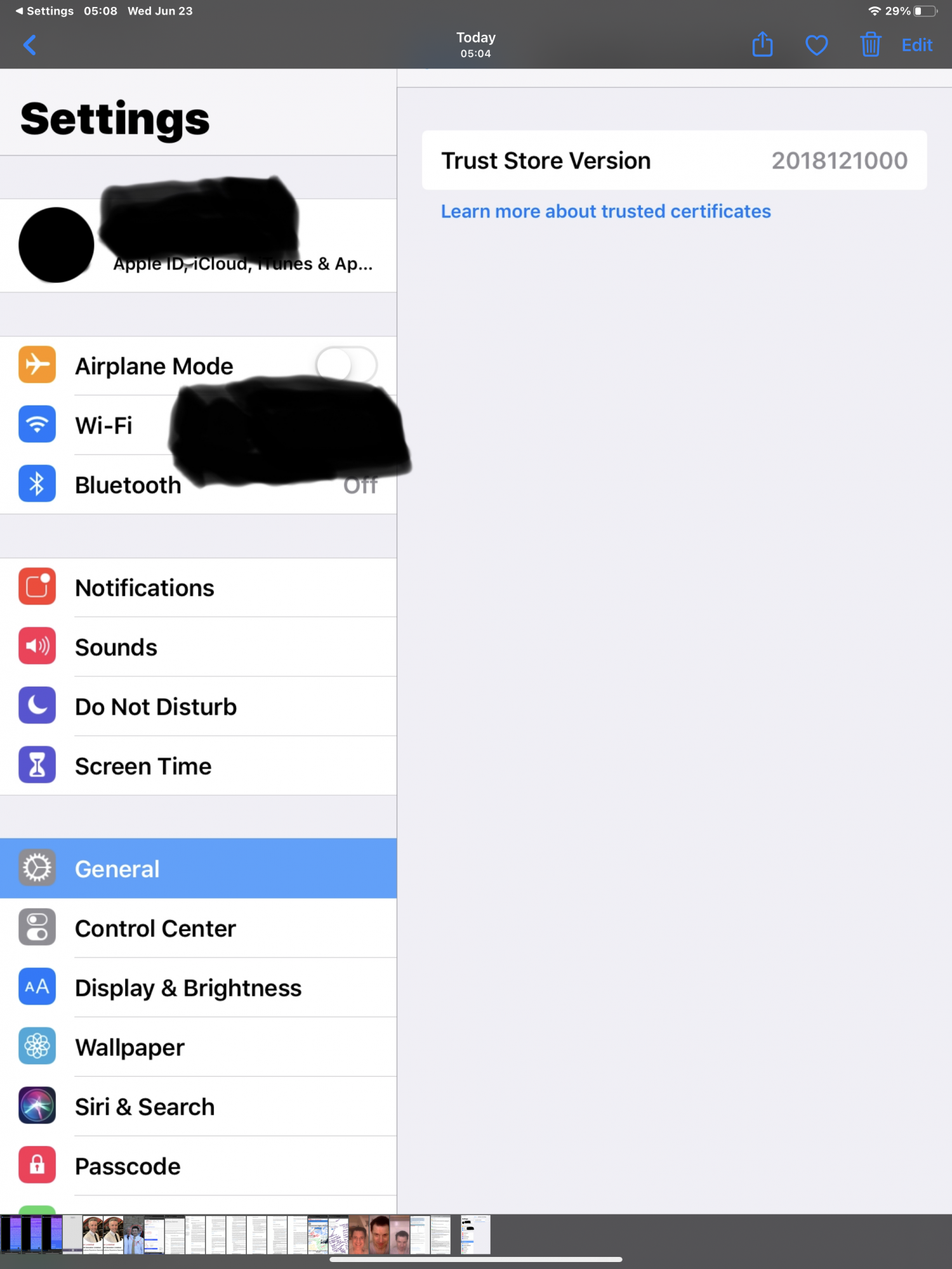 2) In the initial download and upgrade to iOS 13, I saw that the option to select Cisco VPN certificates was no longer possible - which makes sense since I did not have a Cisco VPN installed past or present. And voila, Asset Trust Version xx now appeared on everyone’s iOS devices. Prior to that the field was not present on my devices (as shown on my screen print) until the device was compromised. So for a year my two consistent indicators that my device was infected was removed with the upgrade to iOS 13. Unfortunately the problems seemingly tied to those two indicators did not disappear.