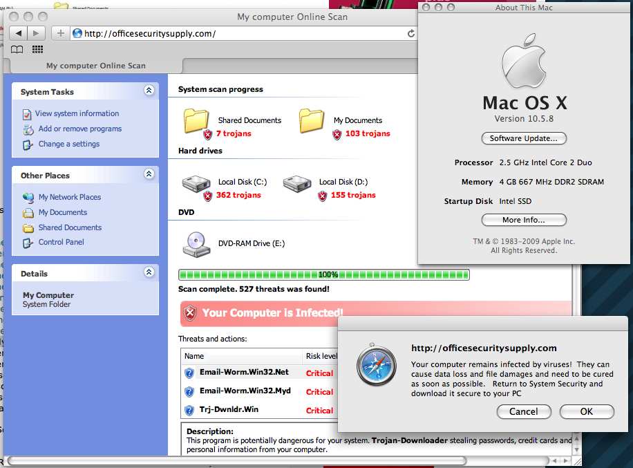 What'd I forget to crop? I showed all the relevent info. A scareware site with a windows xp user interface running safari (A: With the window buttons in the top left of the window) and a shot of "About this mac" clearly showing its not a windows box.