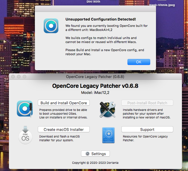 Doesn't impact the system running but does complain that I must install OpenCore on the boot disk since I'm running it on the wrong machine and won't allow me to build any more openCore disks.