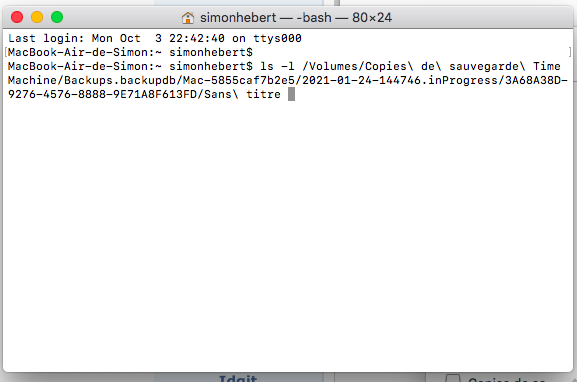 So what you're saying here is that the files are okay and so is the hard drive?No worries. Terminal commands are easy to misunderstand and to mistype. So, that command shows you that the Sans titre file contains your Time Machine backup of your Mac. The folders are there, but you can't open the Sans titre folder for some reason.