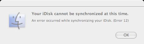 I am online however, and when I try to click the sync/refresh button on the iDisk button in the Finder, I get an error. ("An error occurred while synchronizing your iDisk (Error 12)") The iDisk thus remains offline with folders such as "Software" simply opening a local .rtf that says "The selected directory is only available when the iDisk is online. To access this directory you will need to take your computer online."