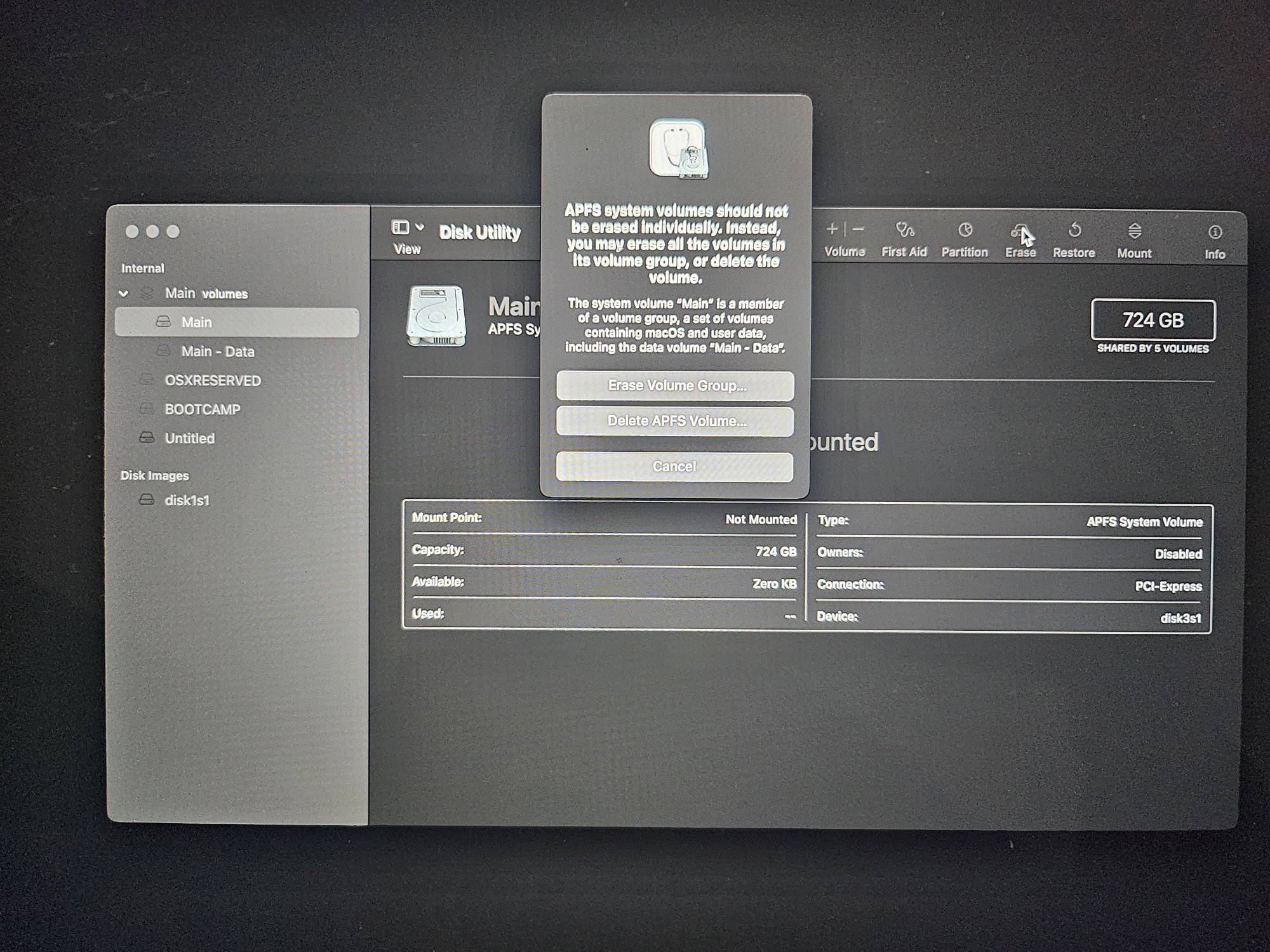 Hey all, I had a test partition on my old 16" 2019 Intel MacBook Pro I was using. Now I want to get rid of it, but I can't do the "-" on it to delete. The error I'm seeing is "You can't remove this volume because the preceding volume can't be resized."