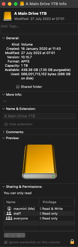 Since then, if I want to make changes using the 'Get Info' dialogue (photo), it accepts my password to undo the lock symbol, but won't let me change anything e.g options like 'Rename' are greyed-out. The same applies if I select 'ignore ownership of this volume'. Blackwatch Speed Test also denies me authorisation to check these drives but I can run it on the internal 250GB SSD.