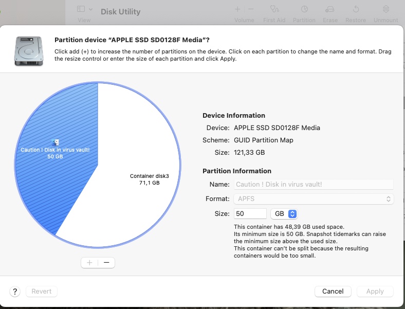 I cleaned up as much as I could and partitioned the drive with a 50GB APFS partition.