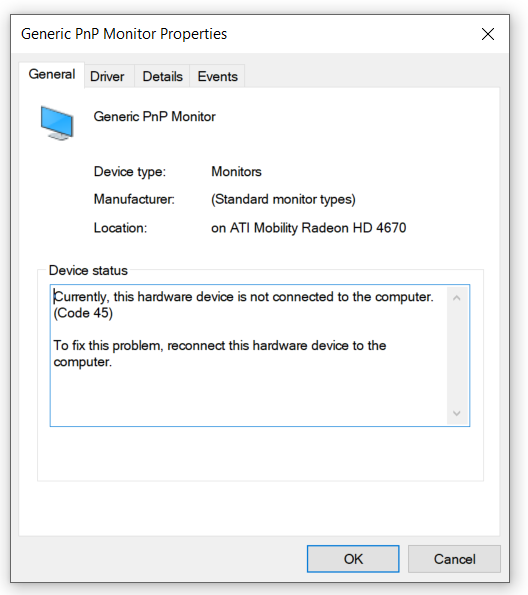 I've selected the 'Show hidden devices' option in Device Manager and now I can see an additional Monitor under display adapter, however it says it's disconnected. See the attached pictures for reference.