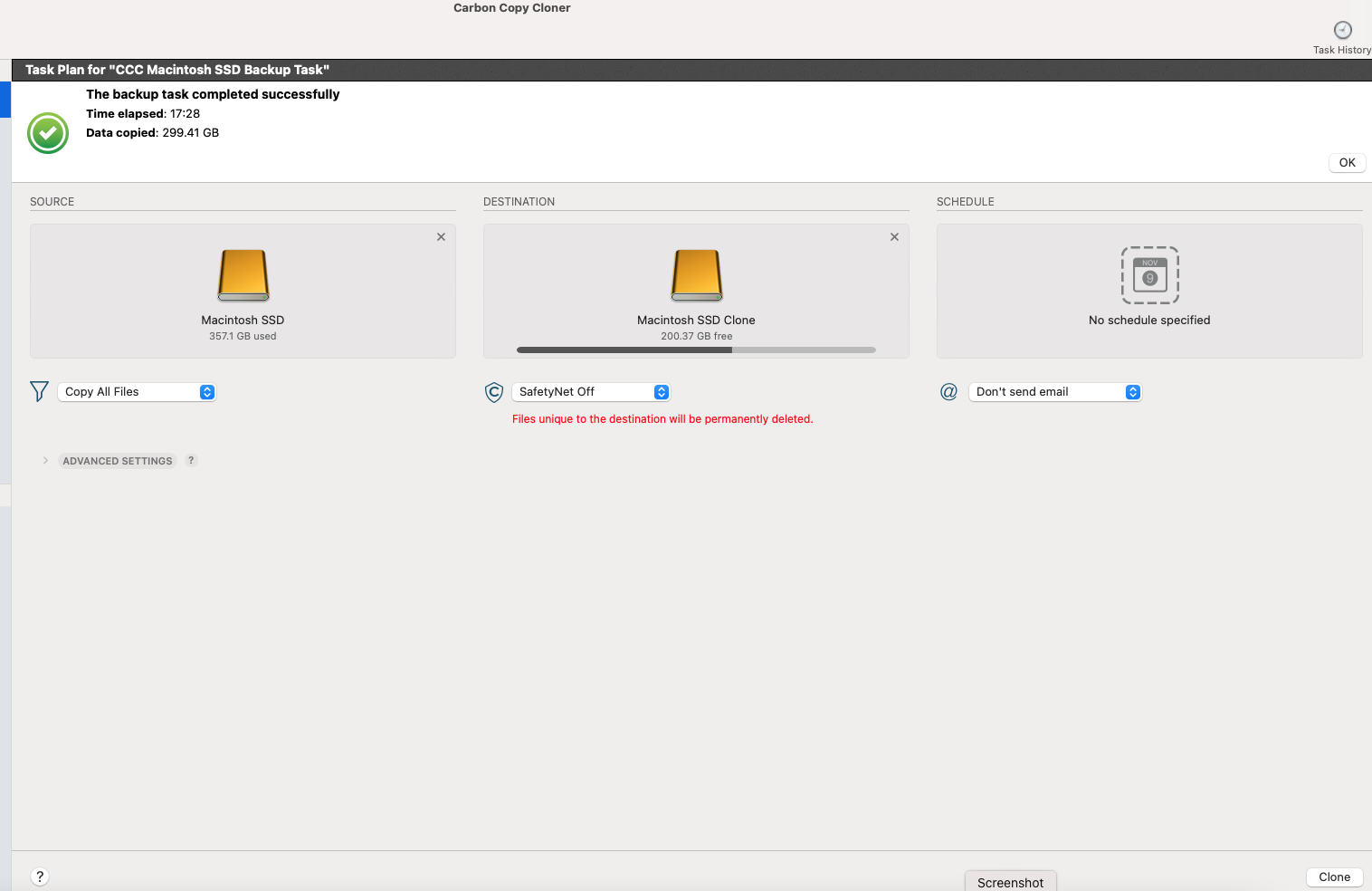 All that being said - I have been backing up 2 times a week (Clone) and never had a back up fail and always boots up fine with the most recent data and files - so CCC seems very reliable in my case and in fact is super fast