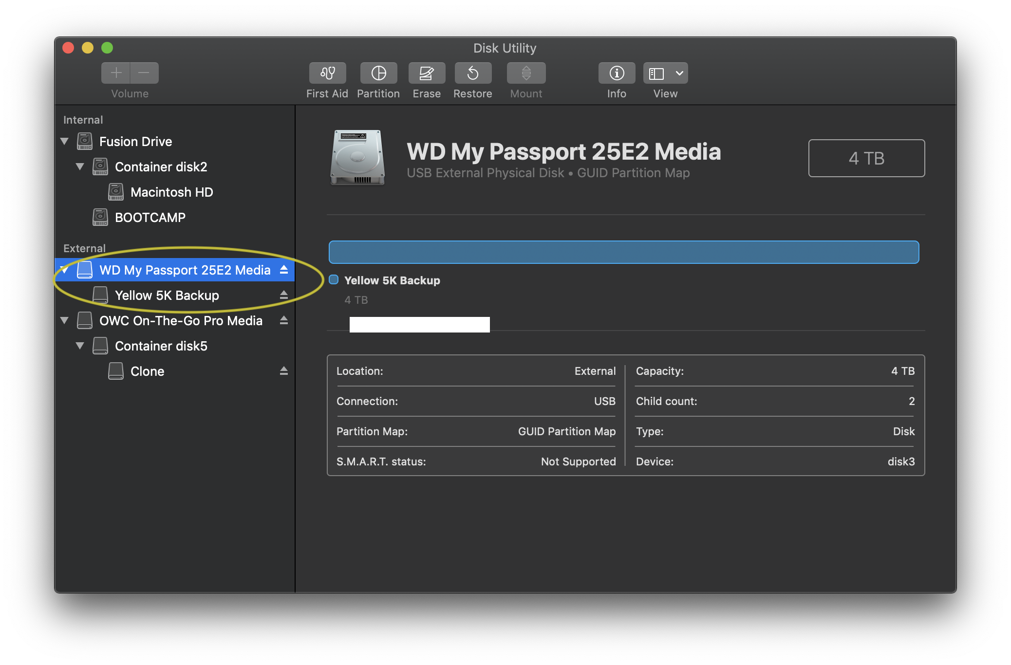 In the good old days before Mojave, I could simply go to Finder, show information for the drive, and change the name there. In Mohave, however, I only see the partition names. The actual HDD itself does not show.
