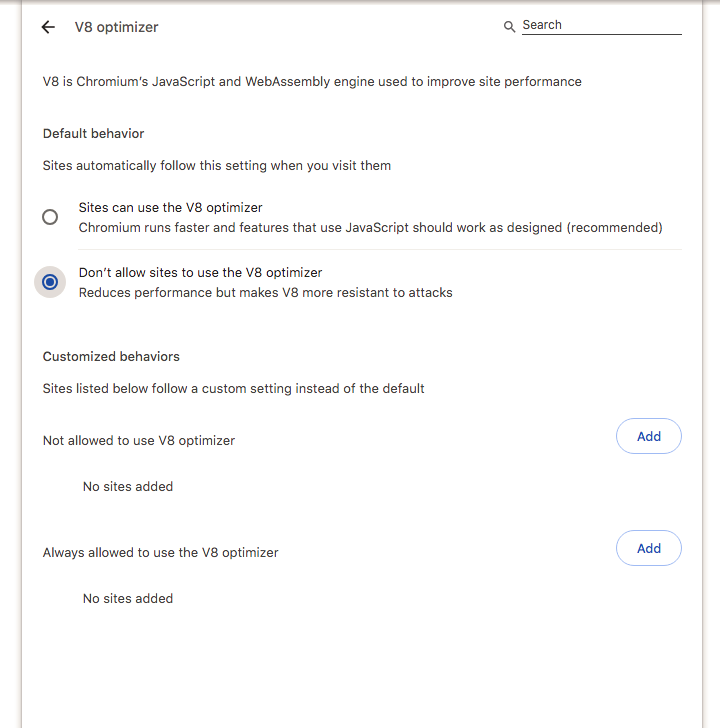 You can re-enable the V8 optimizer for individual websites you trust, speeding them up.
