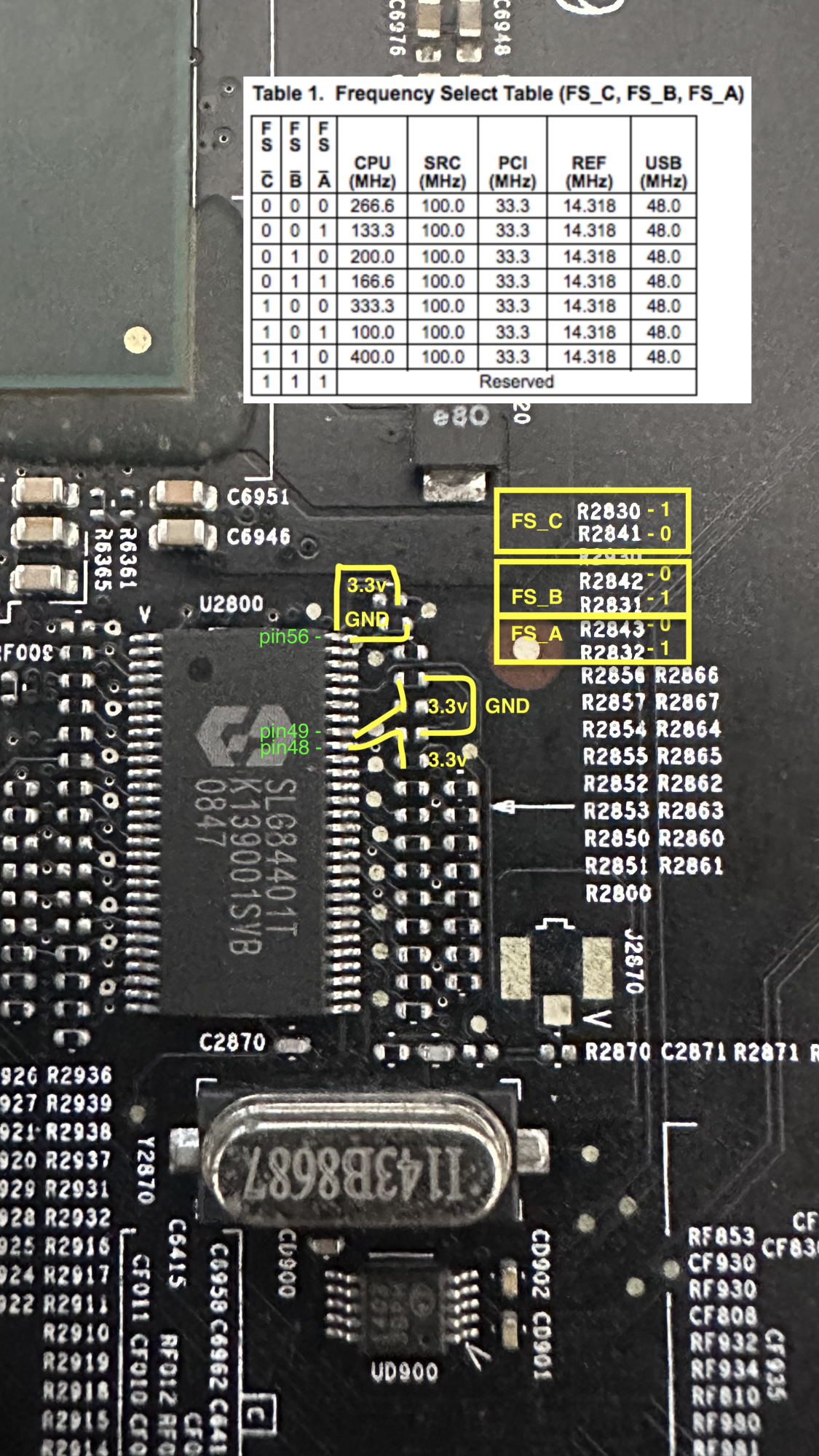 Almost, but not quite as these two gentlemen up posted about straps for BLCK freq. change. Got my hands on a 4,1/5,1 single&dual cpu trays after studying that 84401 datasheet, here are my conclusions; mod should work in theory, will try it myself and post the results if strap change affects clock’s, and yes this mod is old-school pin/strap mod (soldering required) no software can make it permanently except some sophisticated OCLP config. Anyway attaching the picture of strap location & all possible hard-mod BLCK frequencies. It has 6 resistor positions 2 for each strap, 0&1 accordingly