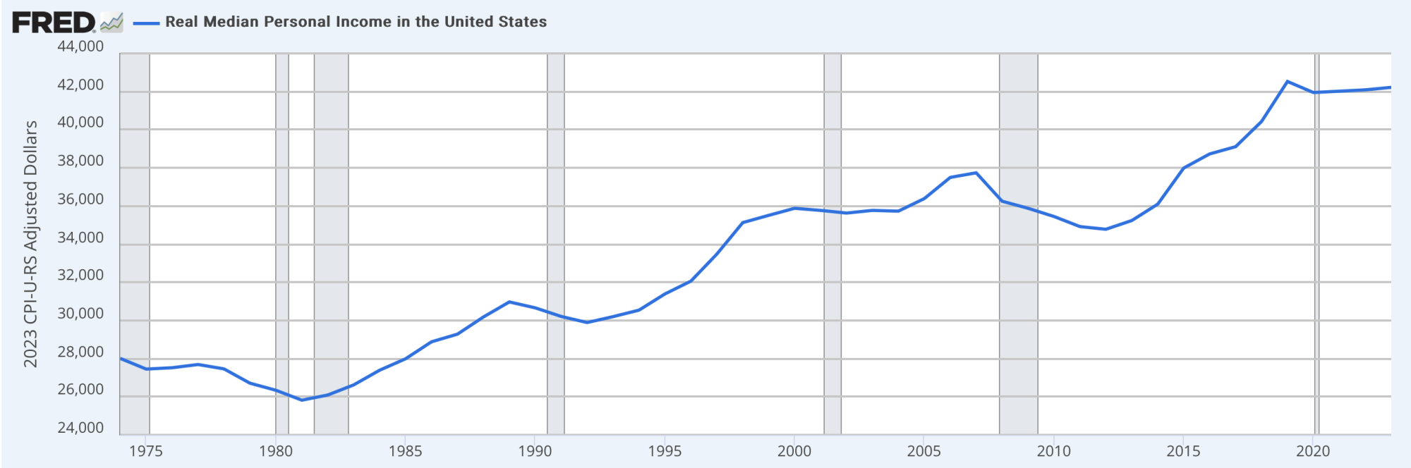 Two completely different eras. Look at 1971 until now. Median personal income is skewed because there are people making billions of dollars per year that makes that number go up. Also, there are people making minimum wage, which hasn't kept up with inflation.