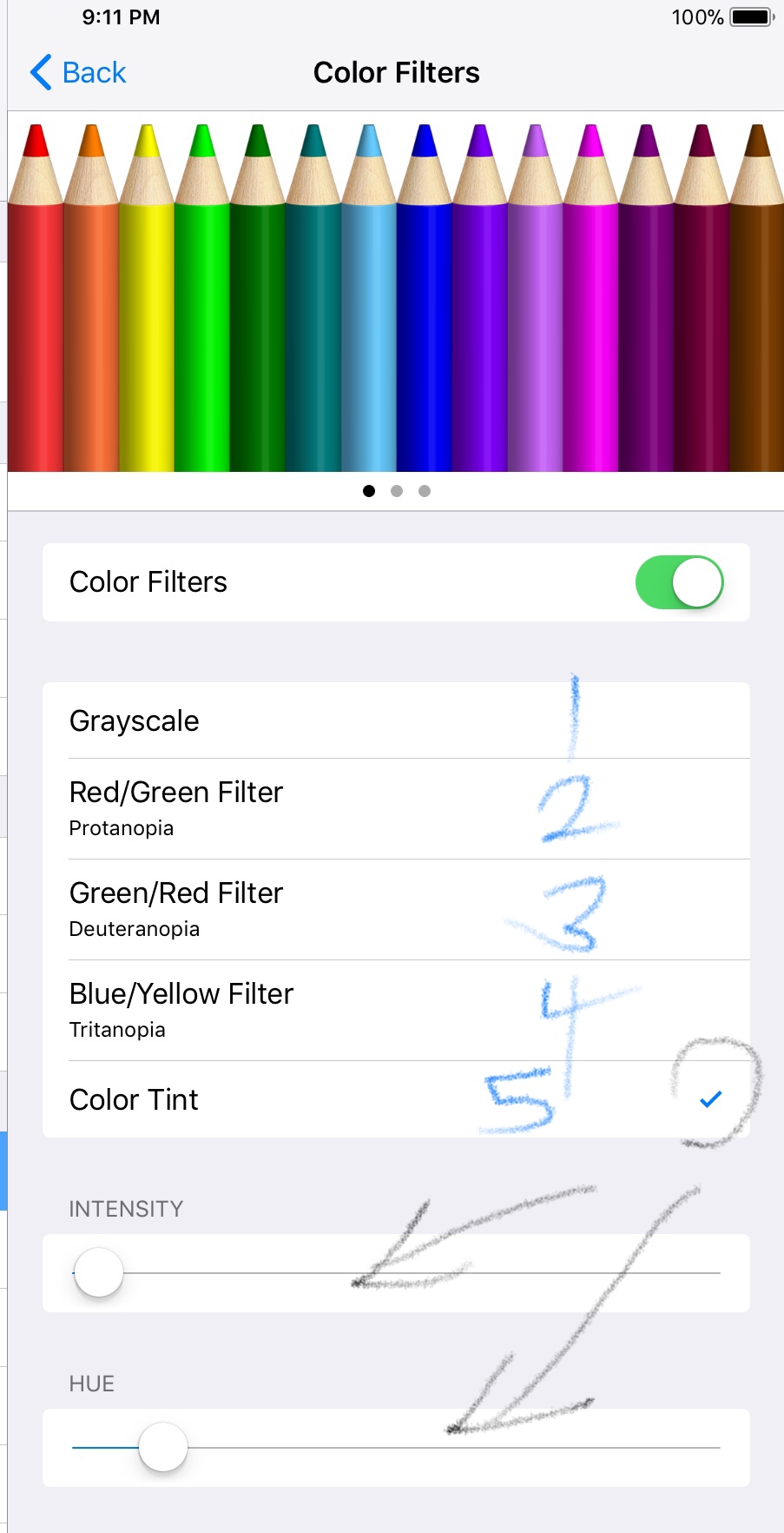 Settings > General > Accessibility > Display Accommodations > Color Filters