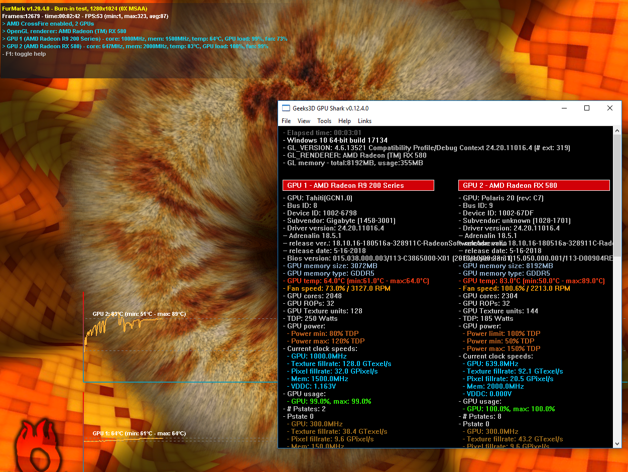 In Windows 10 the exact same setup works fine both cards output to their screens. I can even see crossfire enabled in the Furmark stress test.