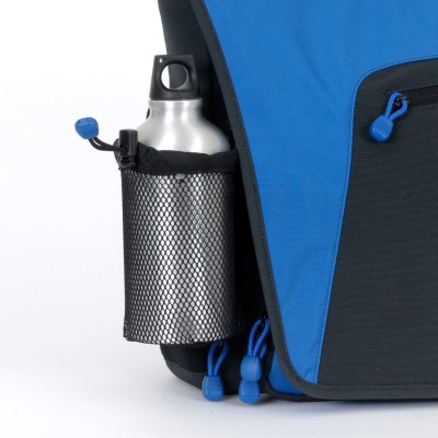 The Skooba Netbook/iPad Messenger has a mesh holder for a water bottle. The really nice thing about it is that there is a zipper pocket the mesh holder comes out of, so when you are not using it you can tuck it in and zip it up and it's out of sight.