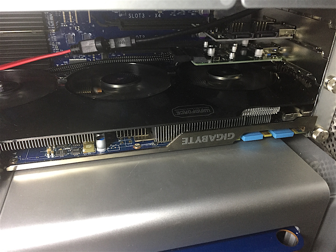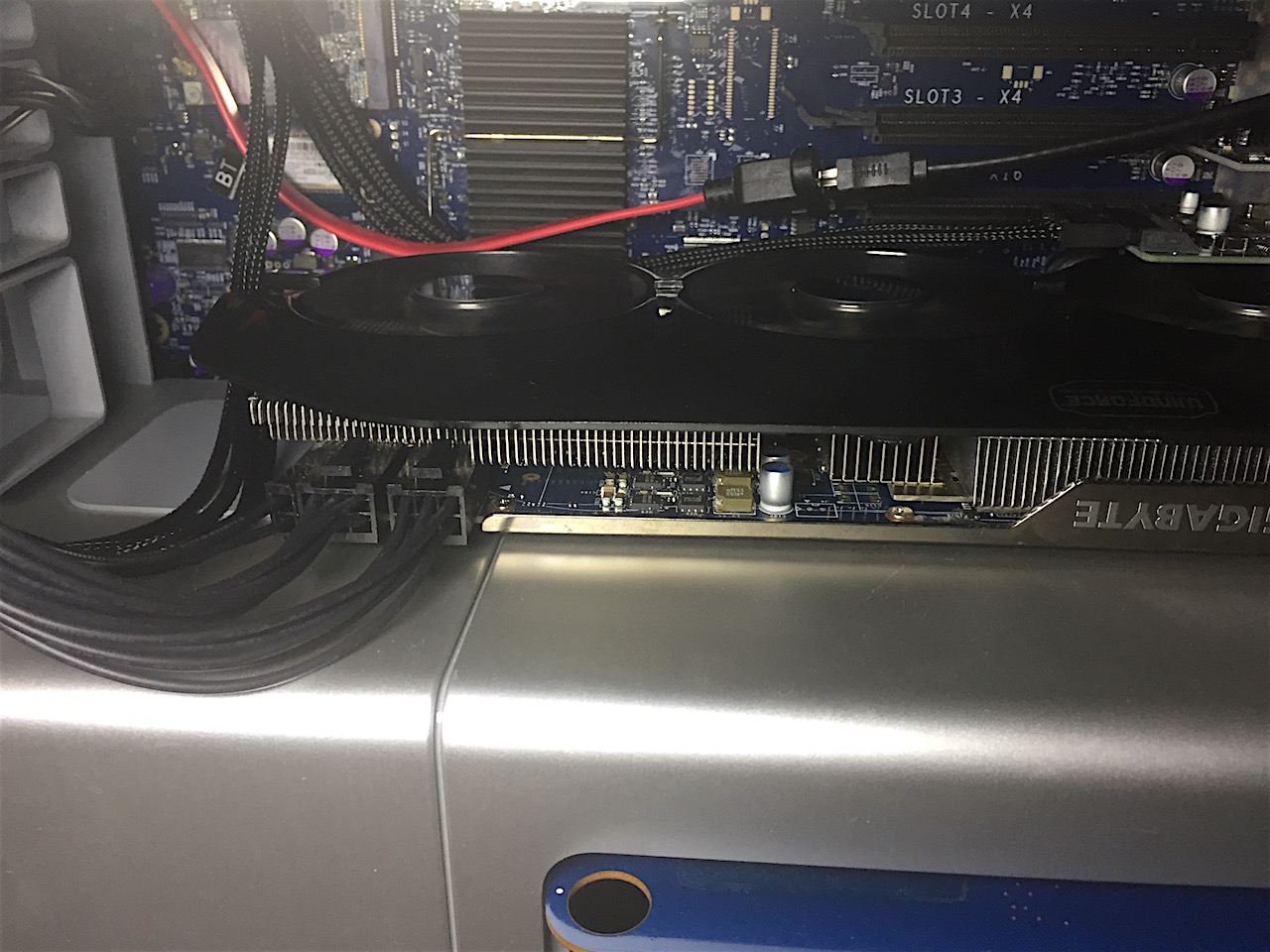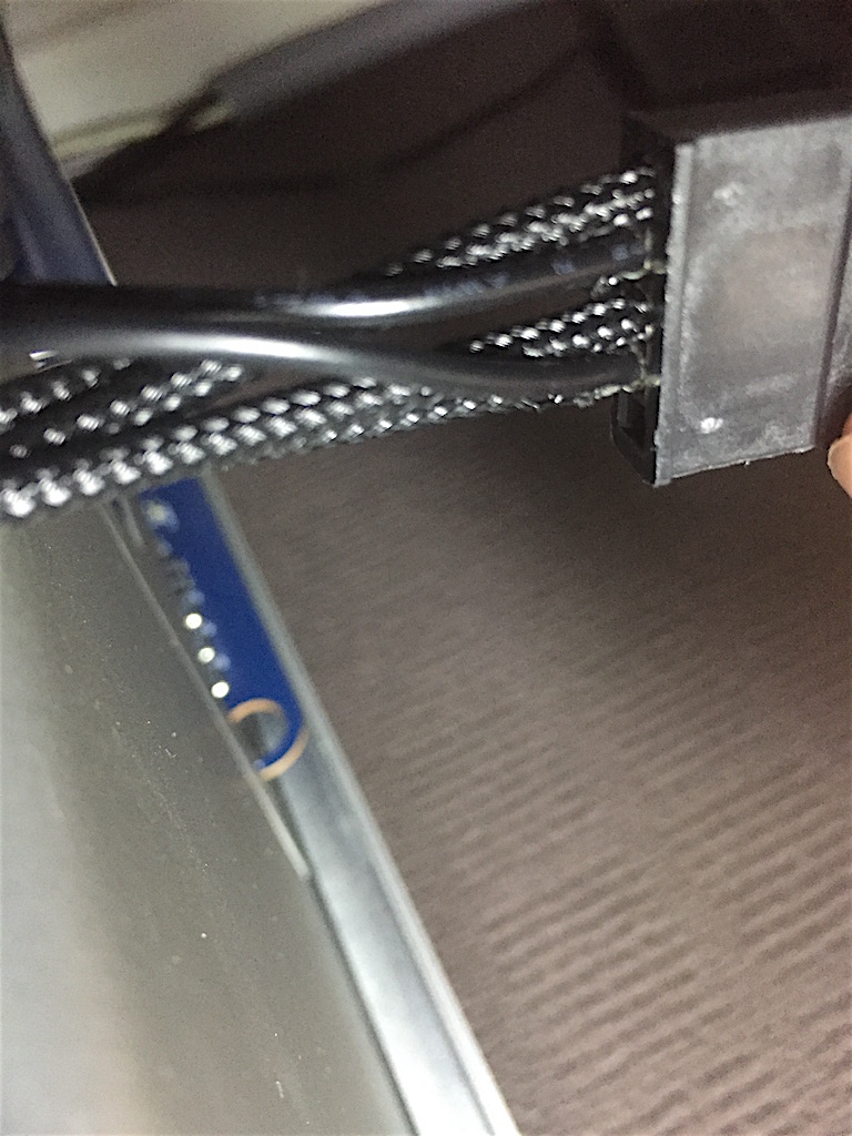 I pulled out the multimeter to test voltage at the two logic board PCIe power lines. Both cables tested 12.2v across their three pairs. I then began a series of trial and error attempts by shuffling PCI ports and power plugs, removing my other PCIe cards (USB3.1 and SATA III) and removing other devices (optical drives and hard drives) to try reducing power requirement in case it was a power supply issue.