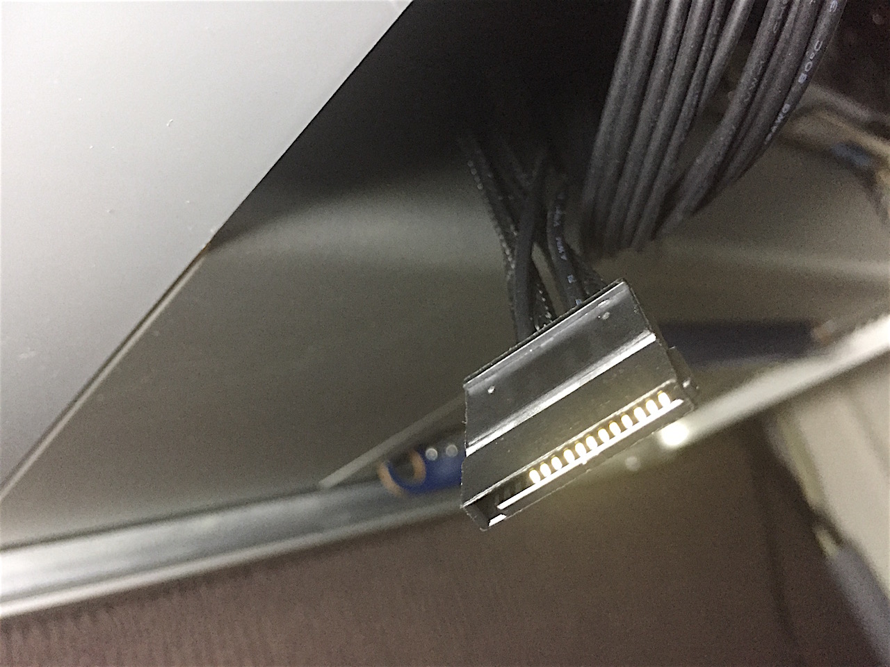 View attachment 694148 Photo 4 - Front of the piggybacked SATA power plug. I then tuck this into the gray plastic channel at the front inlet fan. There's a slot down the outer side that is a perfect height and won't allow the plug to come in contact with the Mac Pro's aluminium side panel.