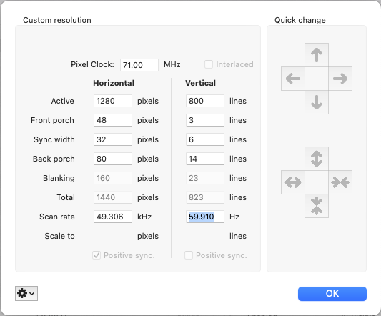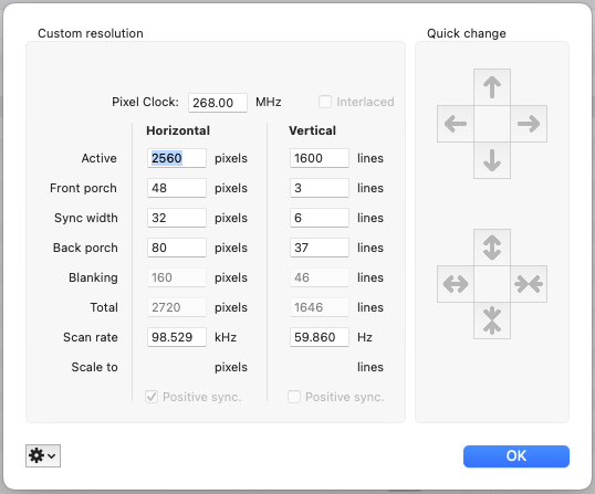 Or, In SwitchResX, double click the current resolution selected for the 30" ACD. Do the numbers in the timing info match the numbers in the EDID?