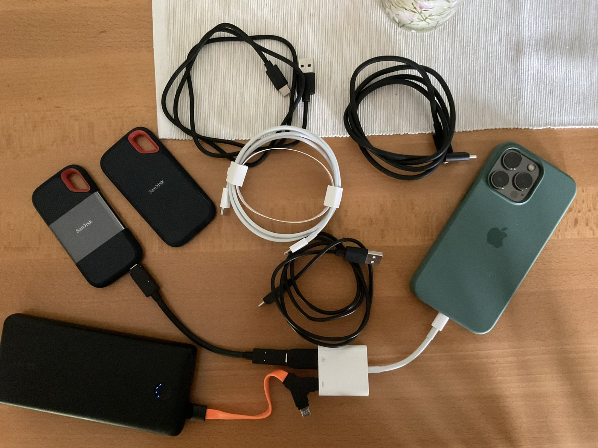 It looks like you tried a variation on this idea by plugging your power bank into the same adapter as the usb drive. Shame that didn’t work. It’s possible the adapter only sends power one way (to the phone) and not also to the external SSD.